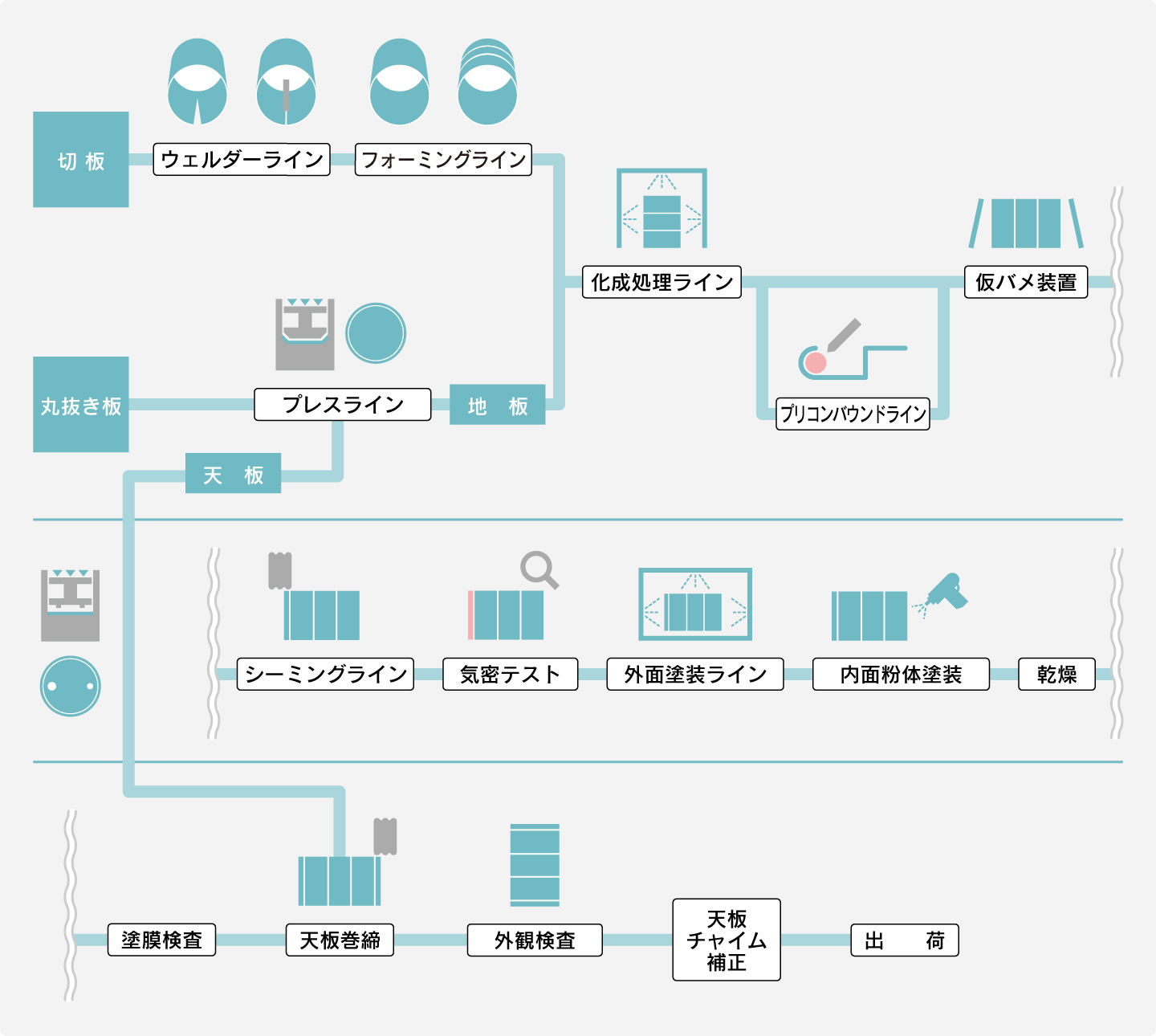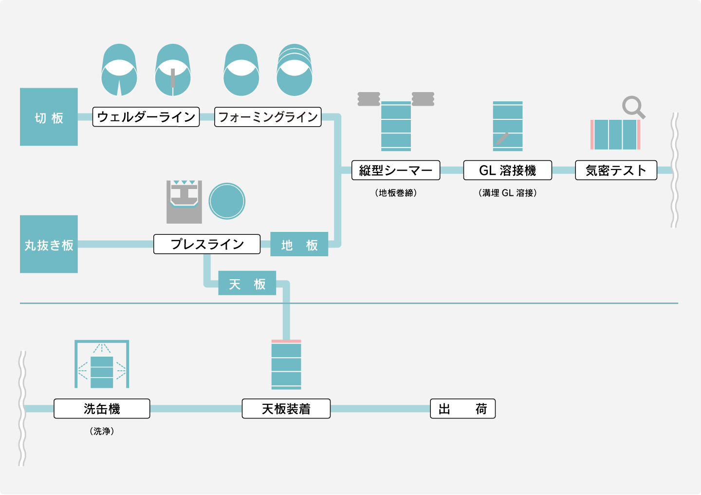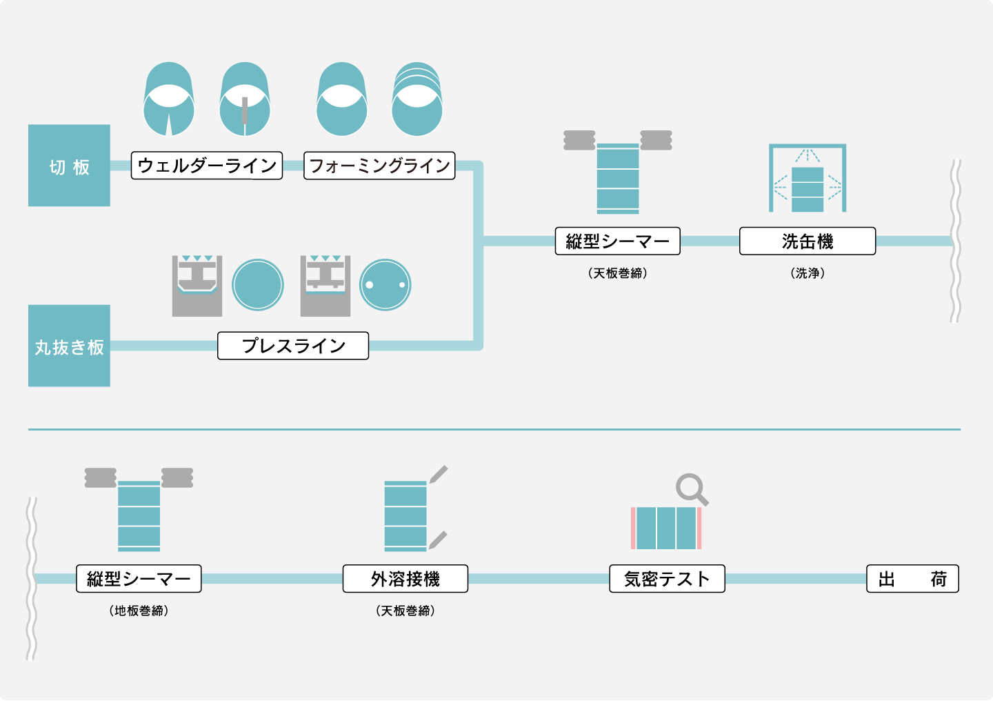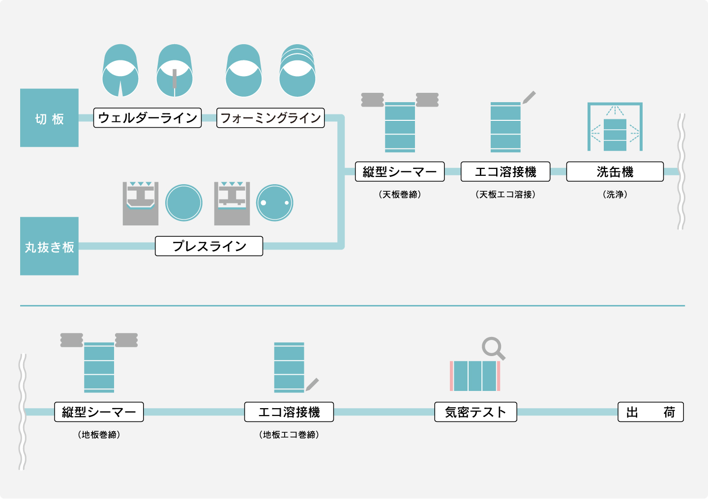 ■スチール缶 製造工程 ■ポリマイト缶 製造工程 ■ステンレス缶 製造工程 【外溶接タイプ】 【エコ溶接タイプ】 【GL溶接缶(オープン缶)】 スチール缶 製造工程 ポリマイト缶 製造工程 ステンレス缶 製造工程 ページトップ